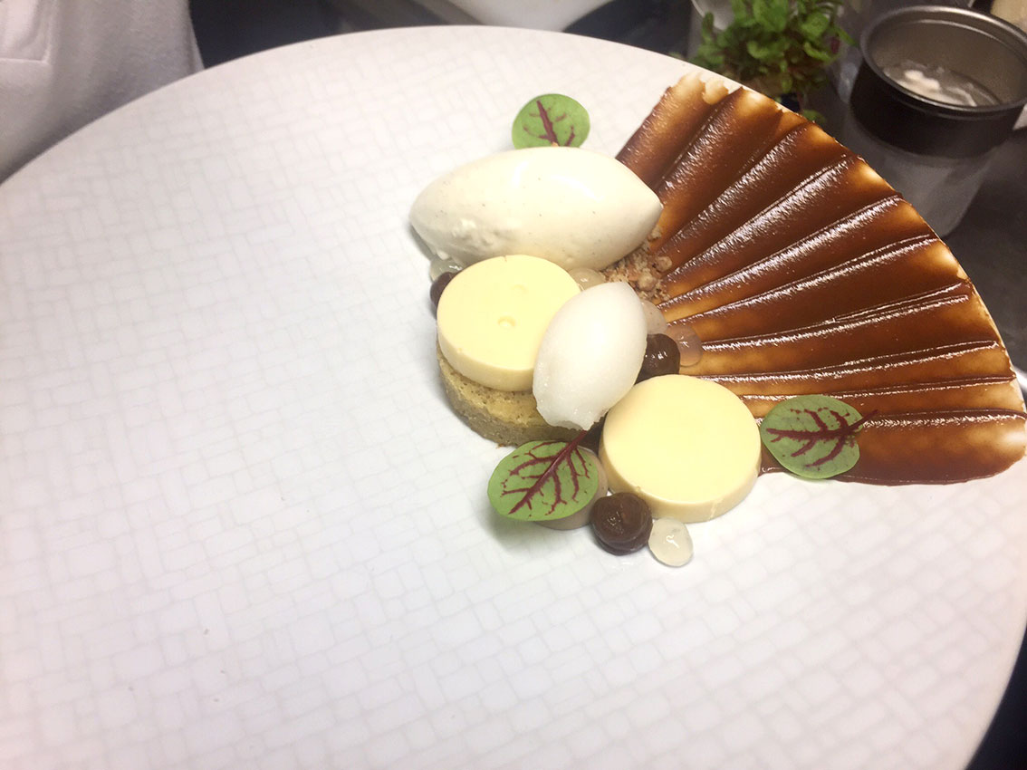 On vient de changer la carte donc, le poisson est en entrée. Je travaille des huîtres plates avec une vinaigrette au miso, un granité au yuzu saque, une crème et un croustillant au miso. L’autre entrée est à base de viande. C’est un tartare de bœuf Angus avec un bouillon Dashi, crème de Coriandre, graines de moutarde et un croustillant d’algues. Sinon à la carte, j’ai toujours un poisson noble et un autre moins noble, mais toujours de très bonne qualité.