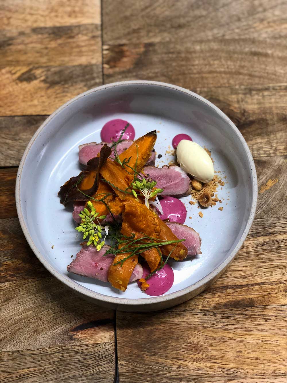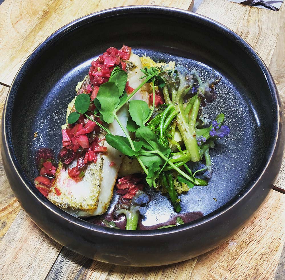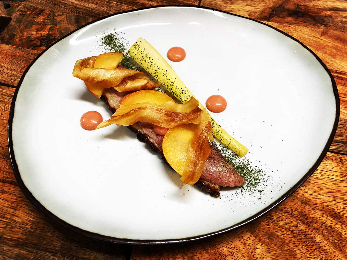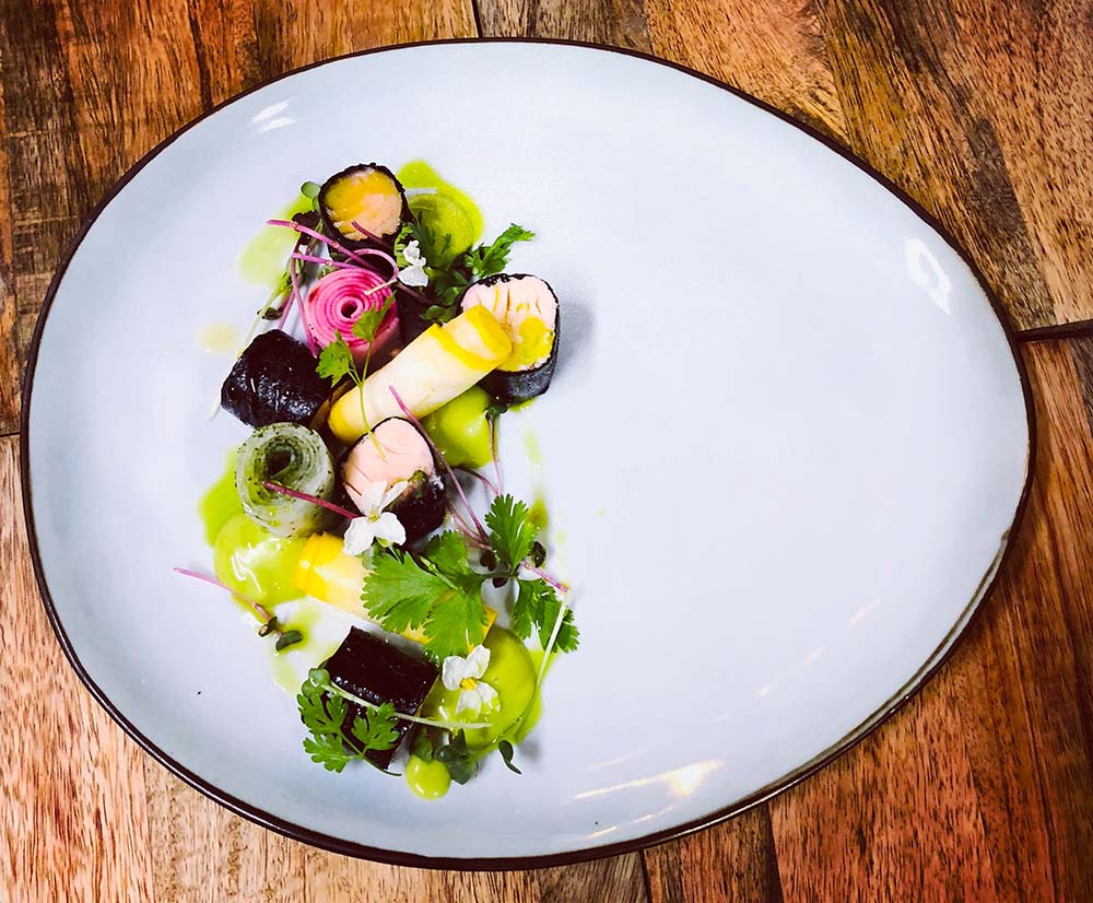 On essaye au maximum d’avoir des produits locaux, surtout les fruits et légumes. Forcément c’est compliqué pour les fruits. L’hiver, ça se limite à deux. On bosse avec un maraîcher bio, “Le monde des mille couleurs”. On essaye d’utiliser au maximum ses légumes. Un truc que j’adore faire c’est décliner un même légume dans l’assiette : par exemple avoir la chips, la purée et le légume brut. J’essaye d’utiliser aussi les racines, les feuilles et les fleurs.