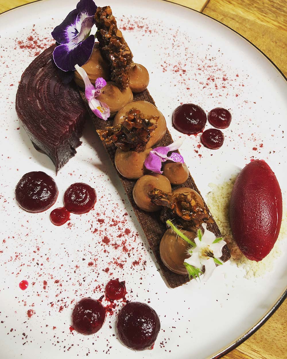 On essaye au maximum d’avoir des produits locaux, surtout les fruits et légumes. Forcément c’est compliqué pour les fruits. L’hiver, ça se limite à deux. On bosse avec un maraîcher bio, “Le monde des mille couleurs”. On essaye d’utiliser au maximum ses légumes. Un truc que j’adore faire c’est décliner un même légume dans l’assiette : par exemple avoir la chips, la purée et le légume brut. J’essaye d’utiliser aussi les racines, les feuilles et les fleurs.
