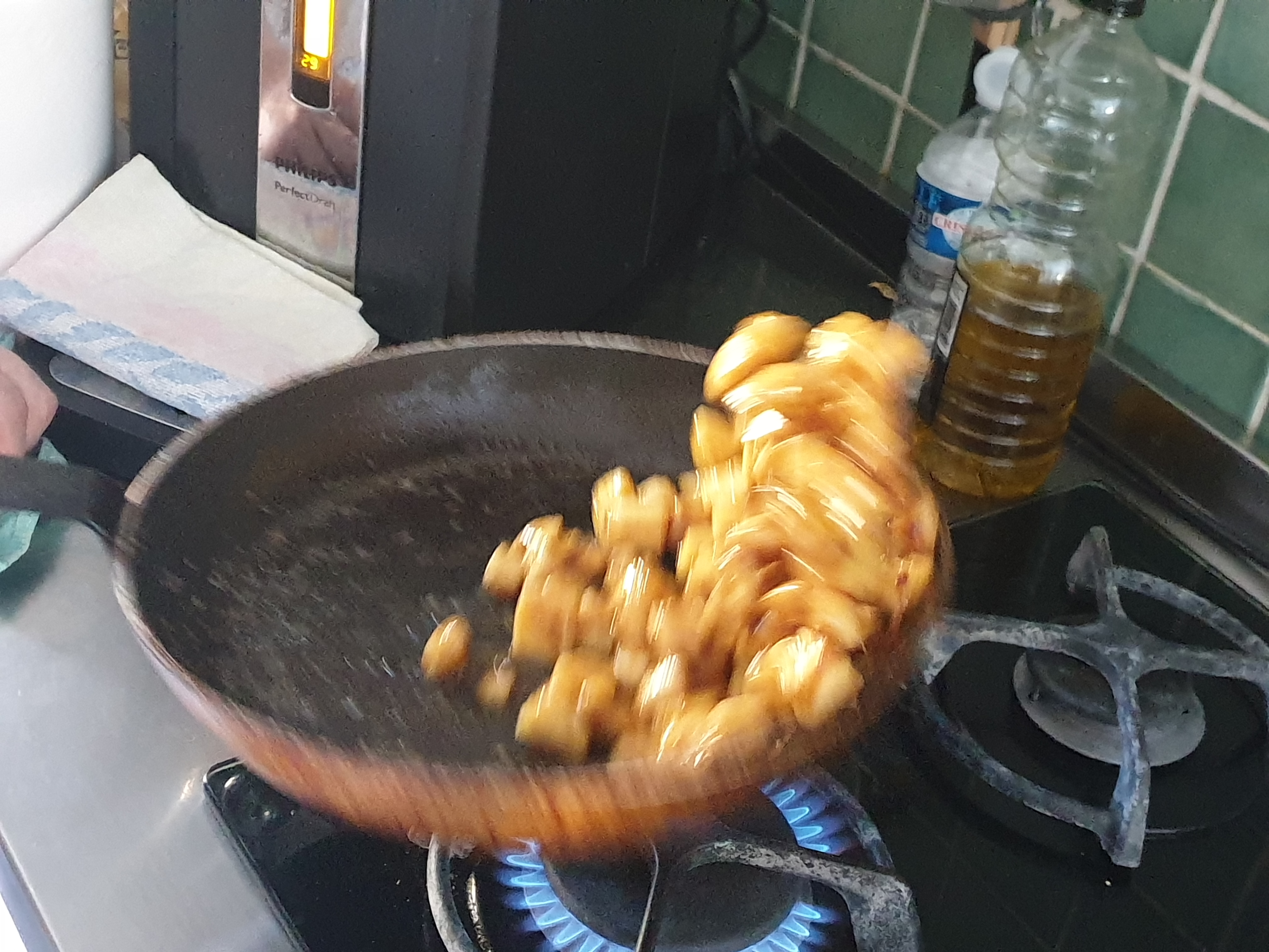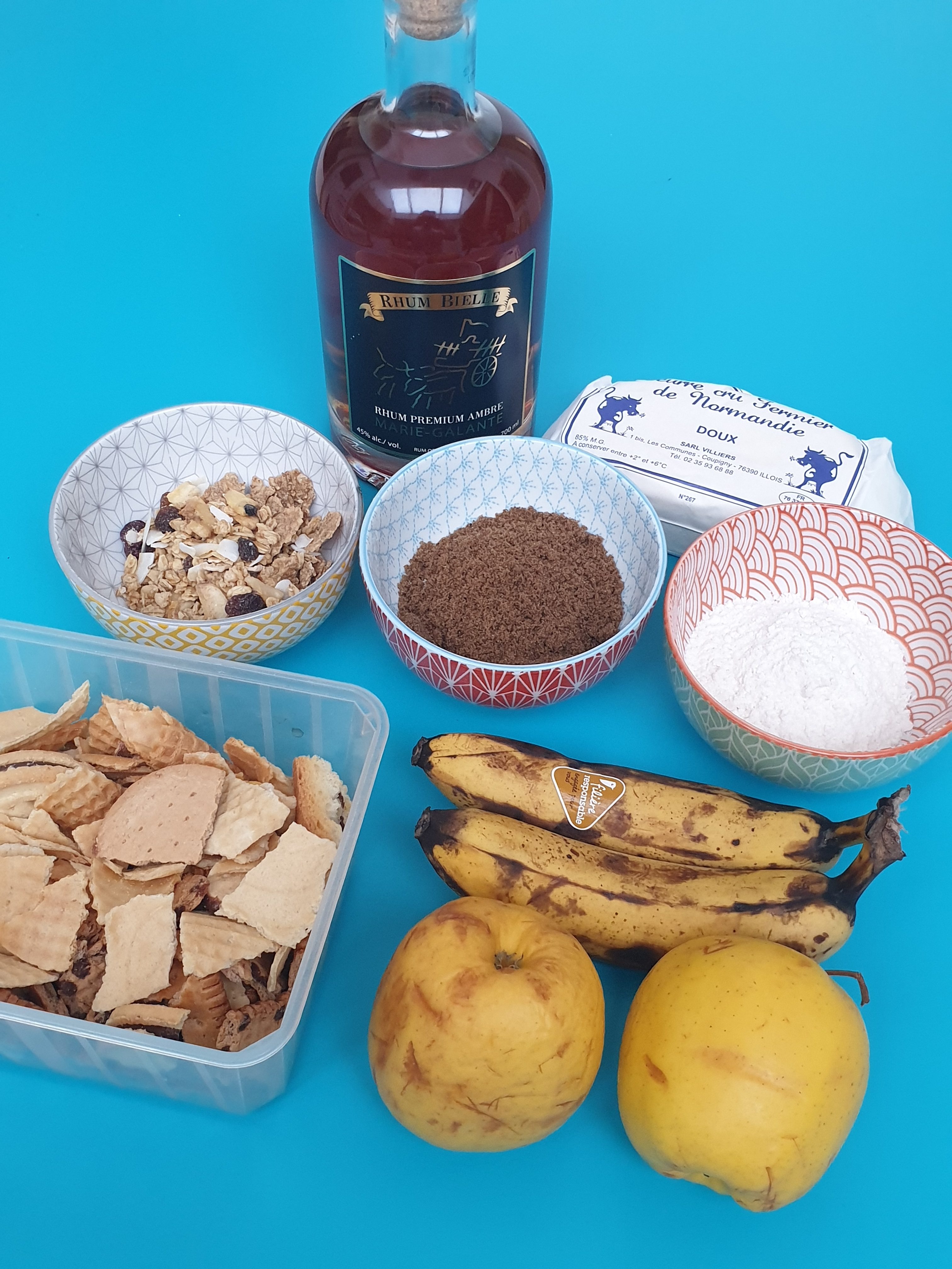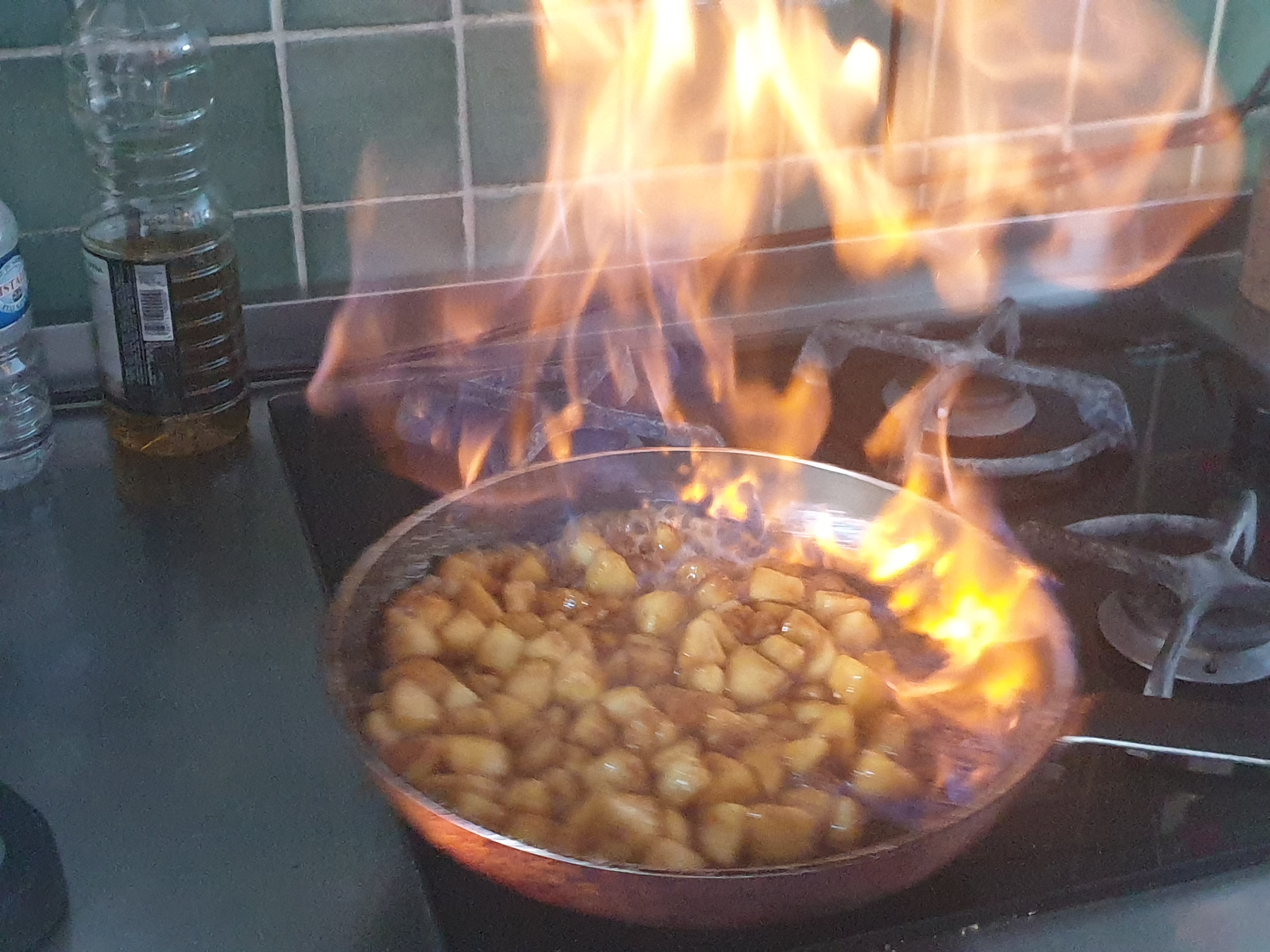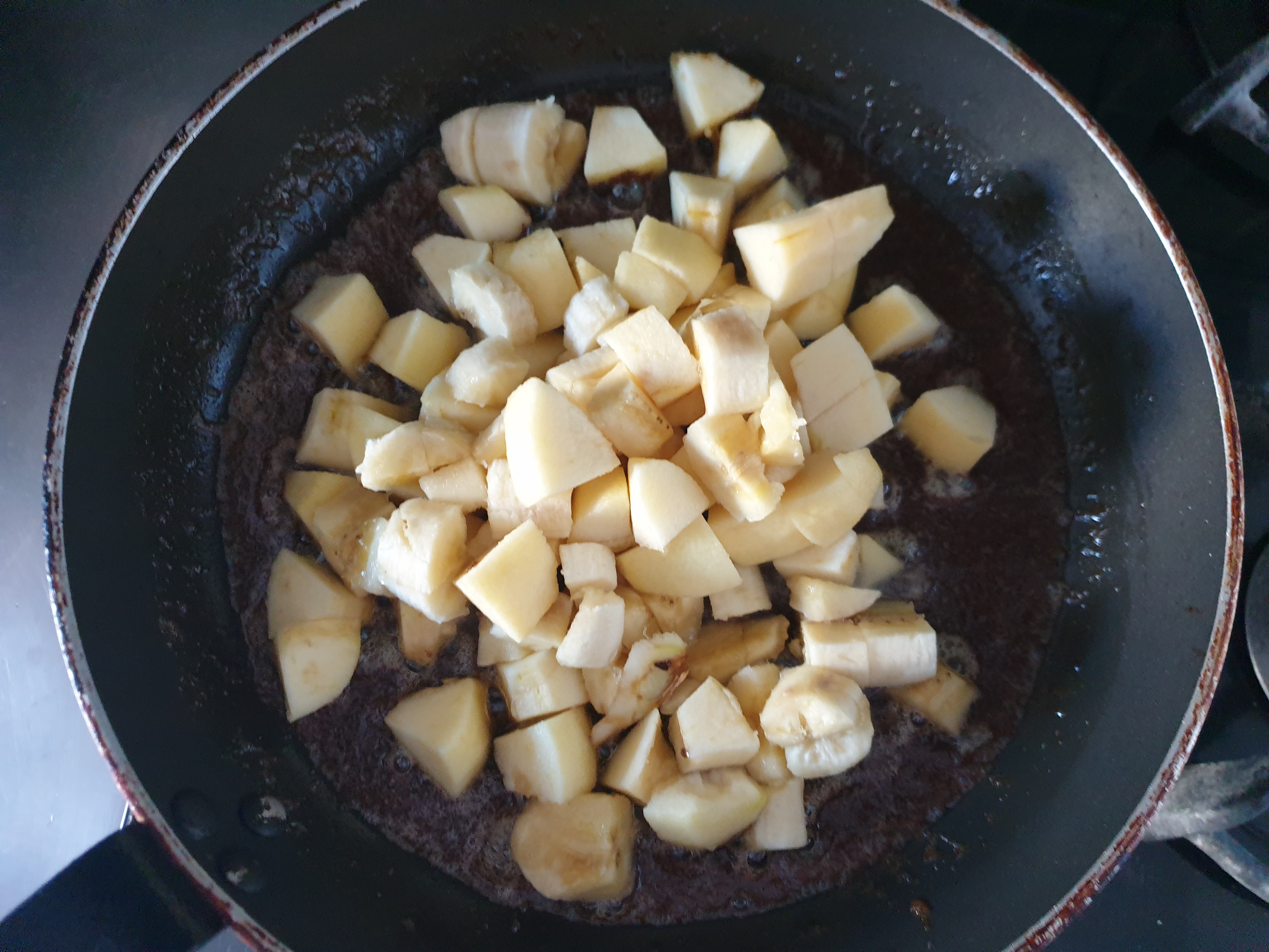 2) Mettre 20 gr de beurre dans une poêle avec 2 cuillères à soupe de cassonade, faire un caramel puis y ajouter les fruits, laisser caraméliser tout en remuant, jusqu’à ce que les fruits soit mi-cuit, flamber avec une lichette de rhum (pas d’inquiétude pour les enfants l’alcool s’évapore a la cuisson), réserver ensuite.