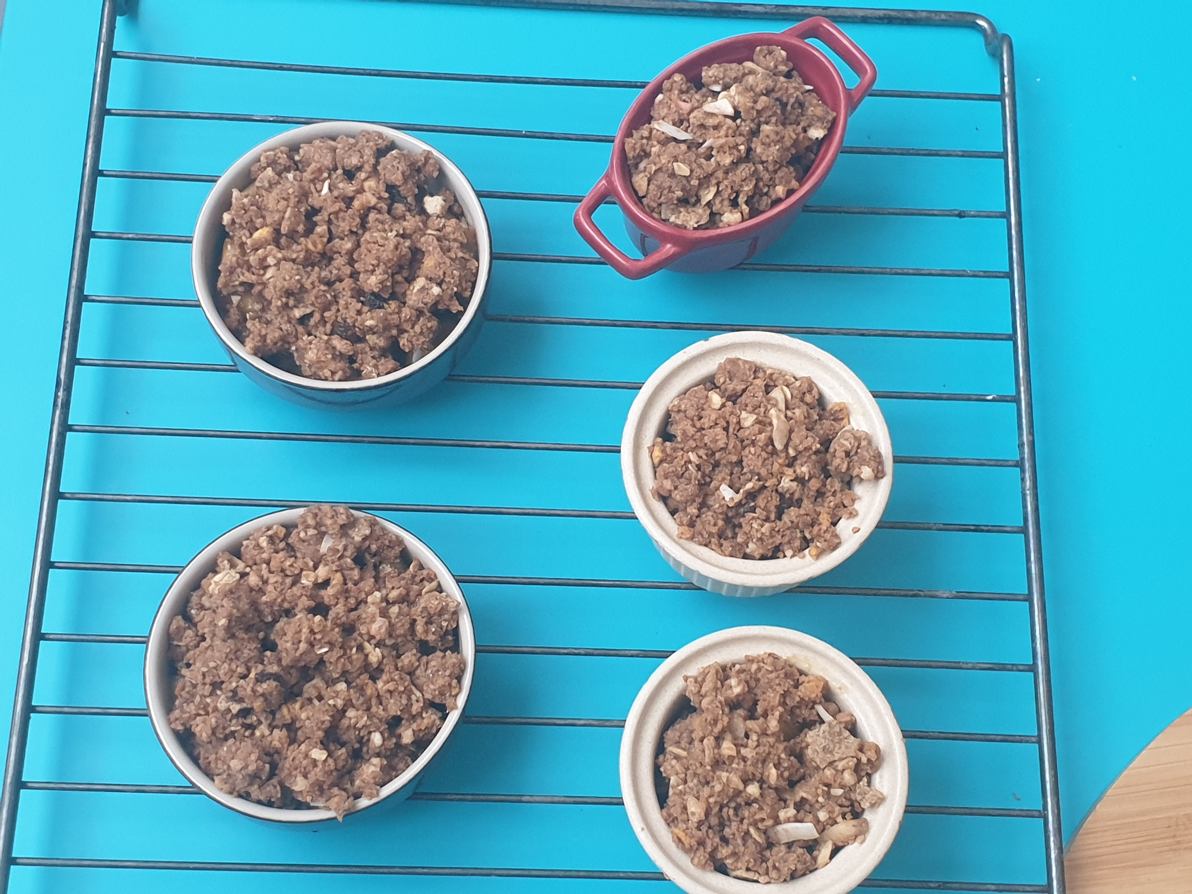 5) Ensuite mettre les fruits au fond de ramequin, émietté le crumble dessus et cuire au four pendant 15 mn