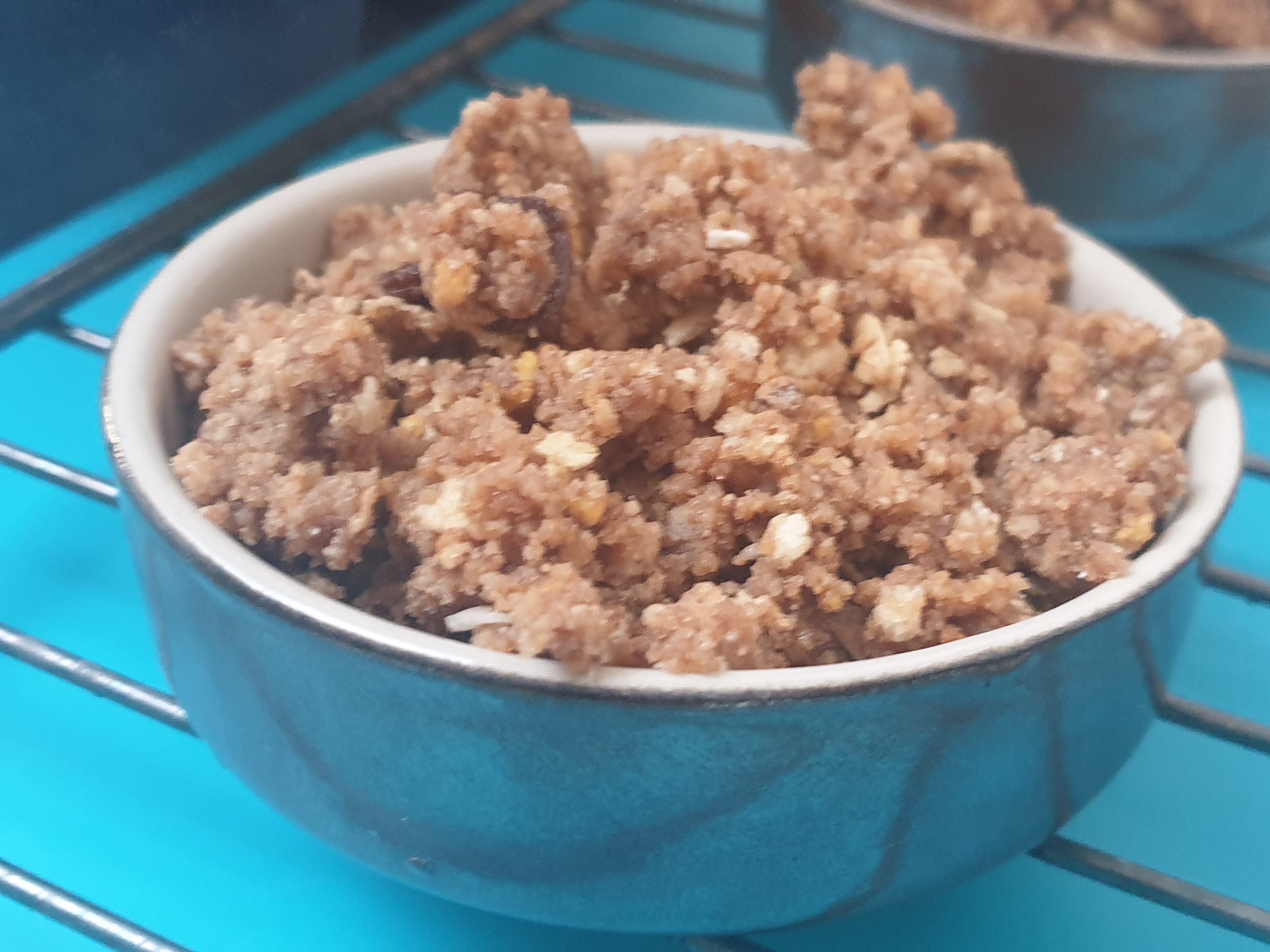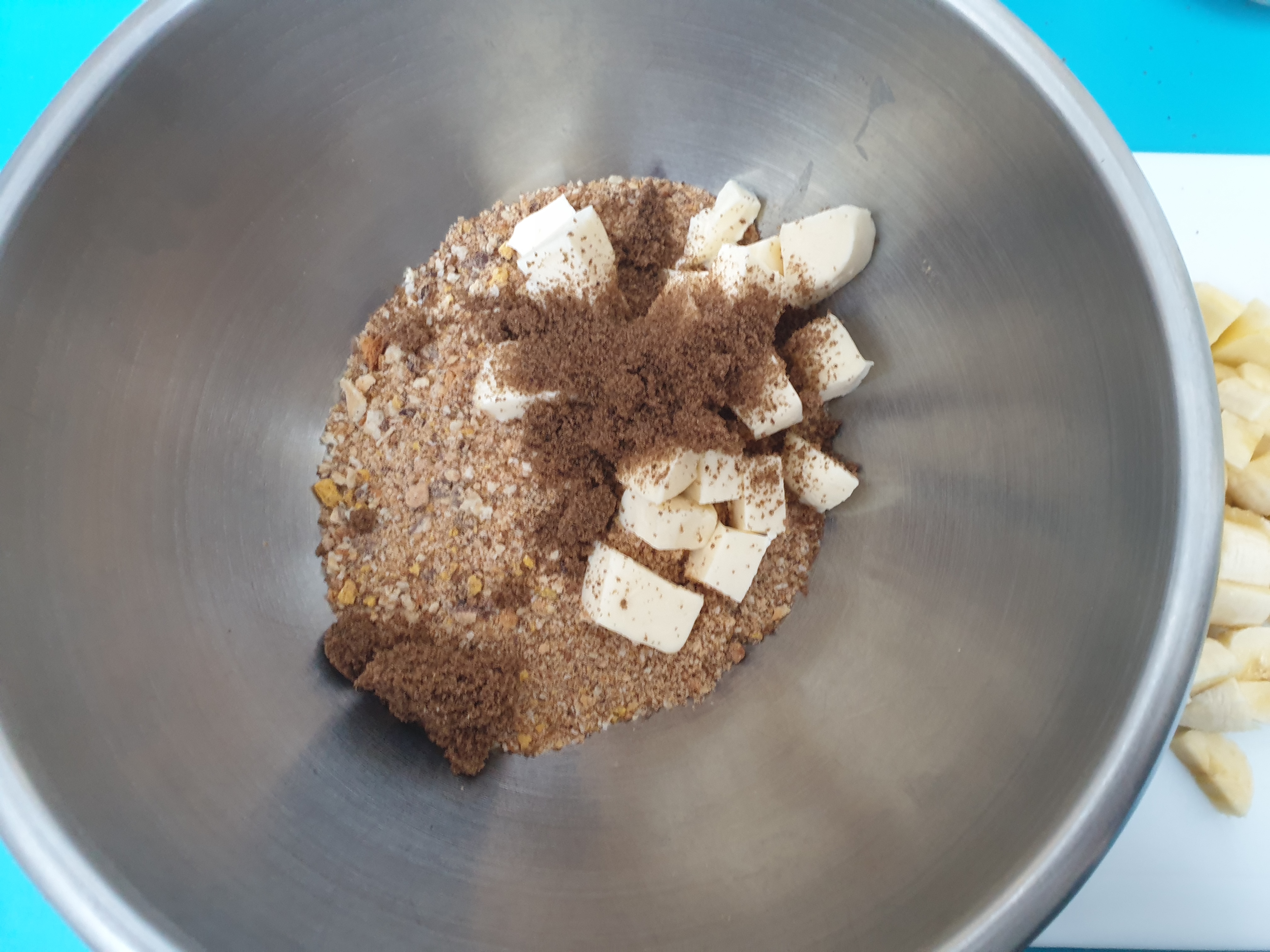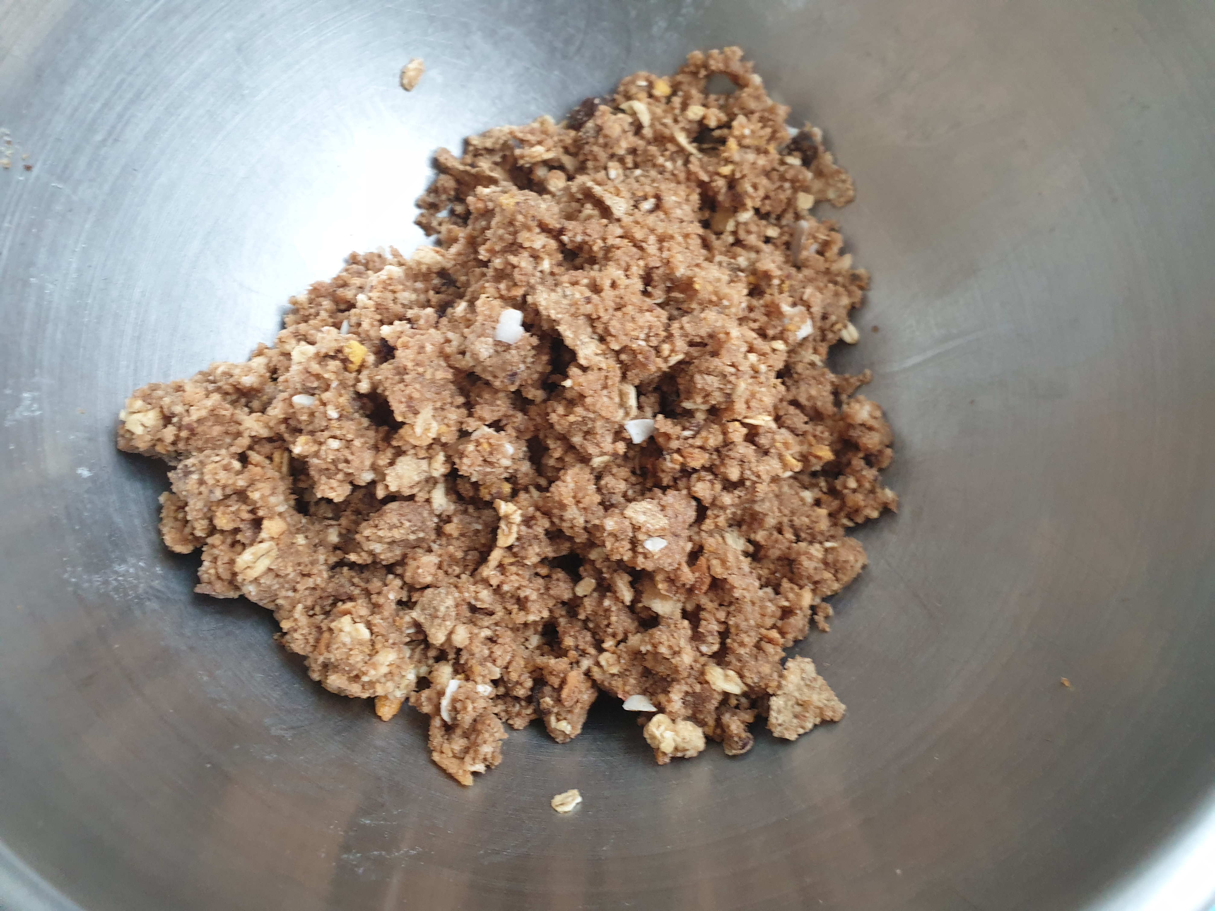 4) Pendant ce temps préparez le crumble en mettant dans un cul de poule les biscuits, préalablement broyé au mixer, ajouter le beurre en petits morceaux et le reste de cassonade, mélanger jusqu’à ce que le beurre soit bien incorporer, ajouter les 2 cuillères a soupe de farine, et les céréales, ne pas chercher à faire une pâte lisse ça doit plutôt faire des boulettes,