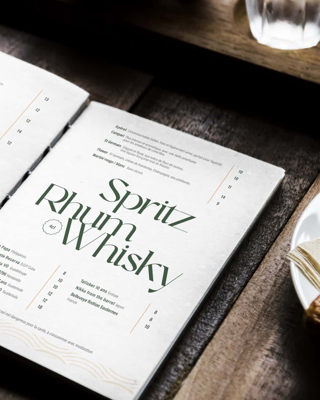 Être lisible dans les conditions réelles — En terrasse en plein soleil, à la lumière tamisée d’une salle le soir, entre les mains d’un client pressé ou d’un client qui prend son temps. Une carte qui ne fonctionne que dans un PDF n’est pas une carte aboutie.
