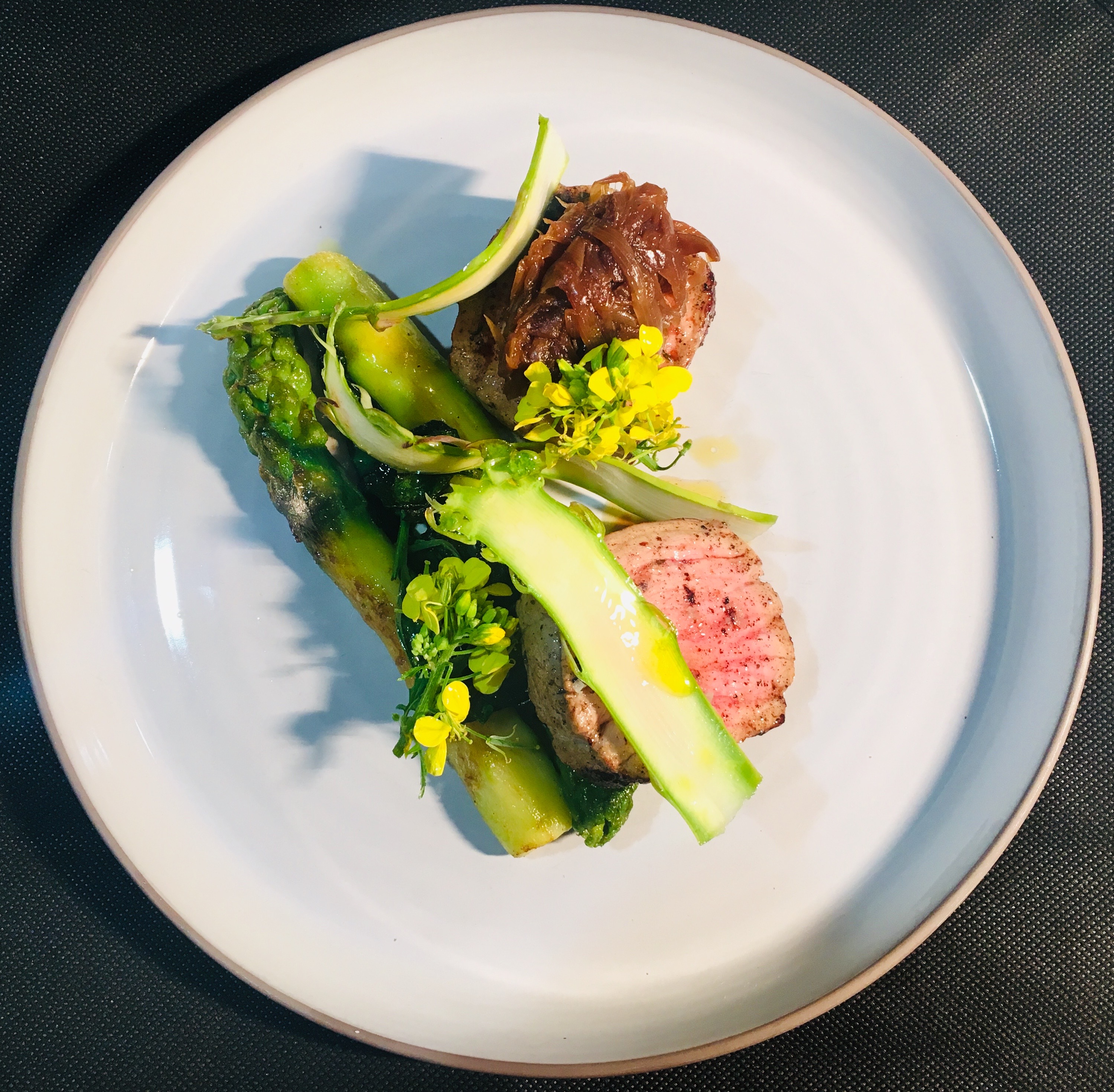 On travaille du cabillaud skrei, un bœuf rumsteak Simmental de façon tartare avec un petit yaourt en entrée. Mais aussi un faux-filet de race normande maturé avec une mousseline d’oignon doux, cecina, c’est de la viande de bœuf séché. On cuisine des asperges blanches depuis pas très longtemps, on a commencé la verte de la région. Essentiellement des produits de saison, c’est primordial. On ne va pas faire des fraises en novembre ou de la rhubarbe en janvier. On a une carte assez courte qui est en permanente évolution.