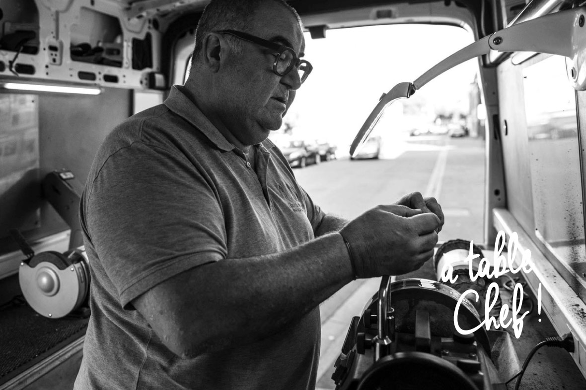 Ensuite, la restauration, c’est un milieu qu’il affectionne particulièrement (comme moi aussi), puisqu’il adore aller dans les cuisines chez ses « clients » amis pour affuter leurs couteaux, et autres objets tranchants.