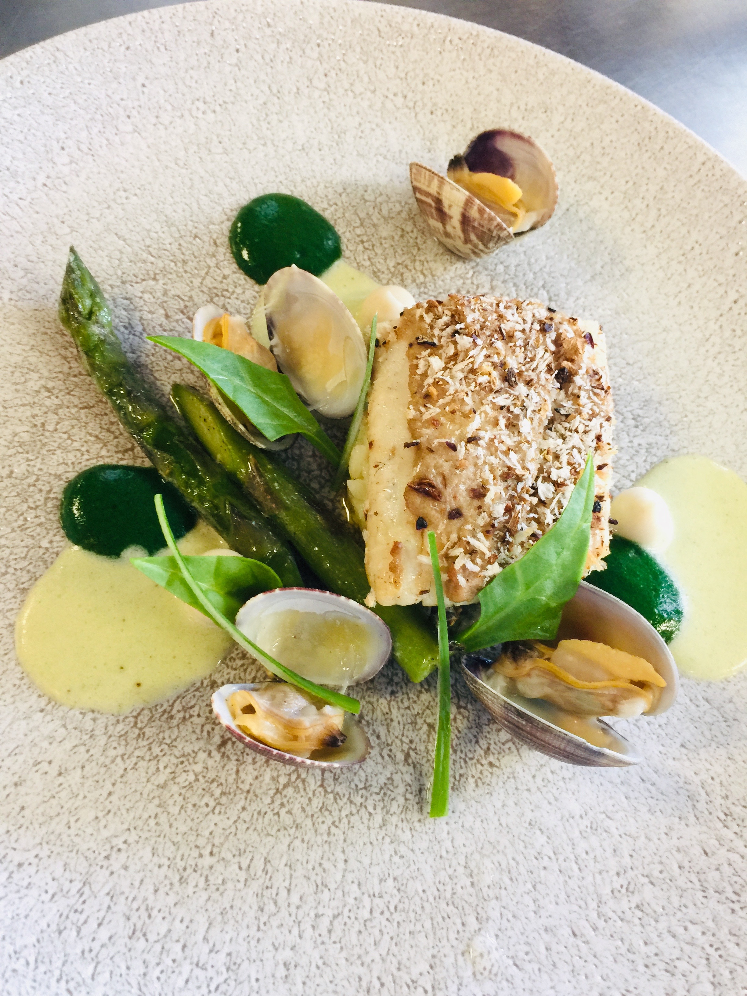 On a deux préparations qui reviennent toujours. On a une asperge à la Flamande, un plat classique travaillé dans une assiette moderne. L’autre c’est une asperge avec des coquillages.